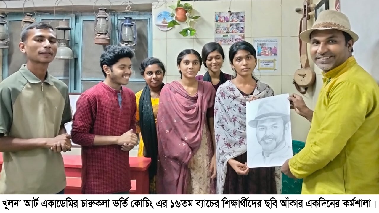 ঢাকা বিশ্ববিদ্যালয়ের চারুকলা অনুষদের ভর্তি পরীক্ষা সামনে রেখে খুলনা আর্ট একাডেমিতে ১৯ নভেম্বর ২০২৫: অনুষ্ঠিত হলো ১৬তম ব্যাচের শিক্ষার্থীদের নিয়ে ছবি আঁকার একদিনের কর্মশালা সকাল ৯টা থেকে রাত ৮টা পর্যন্ত একটানা এই ক্লাস পরিচালনা করেন একাডেমির শিক্ষকবৃন্দ। ২০১০ সাল থেকে চারুকলা ভর্তি কোচিং পরিচালনা করে আসা প্রতিষ্ঠানটি পরীক্ষার পূর্বে এ ধরনের নিবিড় ক্লাসের আয়োজন করে থাকে। এবারের ব্যাচেও তার ব্যতিক্রম হয়নি।সকাল থেকে দুপুর ২টা পর্যন্ত নিরবচ্ছিন্ন পাঠ শেষে শিক্ষক ও শিক্ষার্থীরা একত্র হয়ে একাডেমিতেই দুপুরের খাবারের আয়োজন করেন। এতে অংশ নেন একাডেমির চতুর্থ ব্যাচের প্রাক্তন শিক্ষার্থী গেইনস স্কুলের প্রতিষ্ঠাতা পরিচালক চিত্রশিল্পী মহানন্দ গাইন, বাংলা প্রভাষক উম্মে আরাফাত মতিয়া সেতু এবং ইংরেজি শিক্ষক সৈকত বিশ্বাস।১৬তম ব্যাচের শিক্ষার্থী মোহনা আক্তার বিভা, জয়দ্যূতি সরকার, পূজা শীল, বন্যা বাছাড়, সাগর ফকির, তরি গাইন ও মৌমিতা গোলদার সারাদিনের ক্লাসে সক্রিয়ভাবে অংশগ্রহণ করেন।দিনের শেষ মুহূর্তে ১৬তম ব্যাচের শিক্ষার্থী বন্যা বাছাড় প্রতিষ্ঠানের প্রতিষ্ঠাতা পরিচালক চিত্রশিল্পী মিলন বিশ্বাসের দুটি অসাধারণ প্রতিকৃতি স্কেচ উপহার দেন। তার এই উদ্যোগে মিলন বিশ্বাস অত্যন্ত আনন্দিত হন এবং ব্যাচের অন্যান্য শিক্ষার্থীরাও তার সৃজনশীলতাকে আন্তরিকভাবে প্রশংসা করেন।চারুকলা ভর্তির প্রস্তুতিতে শিক্ষার্থীদের এগিয়ে নিতে একাডেমির এই নিবিড় ক্লাস দিনটি ছিল সবার জন্যই স্মরণীয়। এ সময় বাংলা ম্যাম ১৬ তম ব্যাচের শিক্ষার্থীদের উদ্দেশ্যে বলেন আমি ১৬তম ব্যাচের শিক্ষার্থীদের কোনদিন ভুলবো না তাদের এত সুন্দর আয়োজনের জন্য।