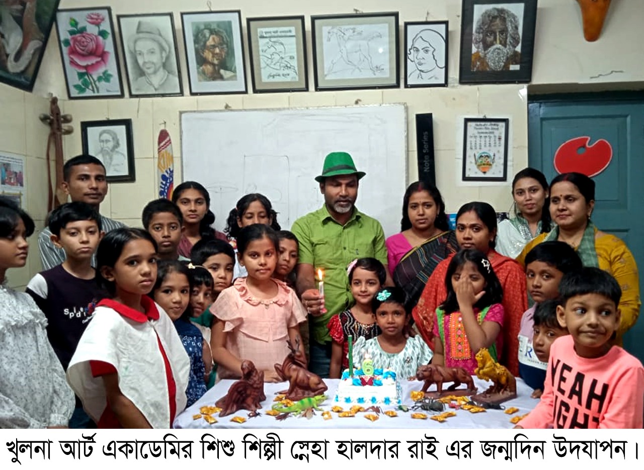 খুলনা আর্ট একাডেমি, ৩৬ আয়েশা কটেজ, ইকবাল নগর স্কুলের পূর্ব পাশে অবস্থিত একটি সুপরিচিত সাংস্কৃতিক প্রতিষ্ঠান। এই একাডেমির শিশু শিল্পী স্নেহা হালদার রাই, সে বর্তমানে প্লে শ্রেণীতে পড়ে, আজ বিকালে ক্লাসে কেক নিয়ে আসে তাৎক্ষণিকভাবে উপস্থিত শিক্ষার্থীদের নিয়ে আনন্দঘন পরিবেশে তার ষষ্ঠ জন্মদিন (১০ নভেম্বর ২০২৫) উদযাপিত হয়। খুলনার প্রাণকেন্দ্রে শিল্পচর্চার পরিবেশে আয়োজিত এই জন্মদিনের অনুষ্ঠানটি শিশু শিল্পীদের হাসি-আনন্দে রঙিন হয়ে ওঠে।এ সময় চিত্রশিল্পী মিলন বিশ্বাস রাইকে কোলে নিয়ে আশীর্বাদস্বরূপ একটি খাতা ও পেন্সিল উপহার দেন। রাইয়ের মা জানান, “মেয়ের ইচ্ছাই ছিল খুলনা আর্ট একাডেমিতেই জন্মদিন পালন করা। শিল্পচর্চার পরিবেশে সহপাঠীদের সঙ্গে কেক কেটে আনন্দ ভাগাভাগি করতে পেরে সে ভীষণ খুশি।”নিজের অনুভূতি প্রকাশ করে রাই বলে, “শিক্ষক, শিক্ষার্থী ও অভিভাবকদের সঙ্গে এমন মুহূর্ত ভাগ করে নিতে পেরে আমি খুবই আনন্দিত।” অন্যান্য শিক্ষার্থীরাও জানায়, জন্মদিনের অনুষ্ঠানটি তাদের কাছে অত্যন্ত ভালো লেগেছে।সমাপনী বক্তব্যে চিত্রশিল্পী মিলন বিশ্বাস বলেন, “রাইকে সবাই আশীর্বাদ করবেন। সে যেন শিল্প-সংস্কৃতির এই স্পর্শে বড় হয়ে দেশের ভালো কাজে যুক্ত থাকতে পারে।”সবার ভালোবাসা ও শুভকামনায় রাইয়ের জন্মদিনের এই আয়োজন খুলনা আর্ট একাডেমির পরিবেশকে আরও প্রাণবন্ত করে তোলে। অনুষ্ঠানের শেষে উপস্থিত সবার হাতে কেক ও চকলেট তুলে দিয়ে আনুষ্ঠানিকভাবে জন্মদিন উদযাপন শেষ হয়।