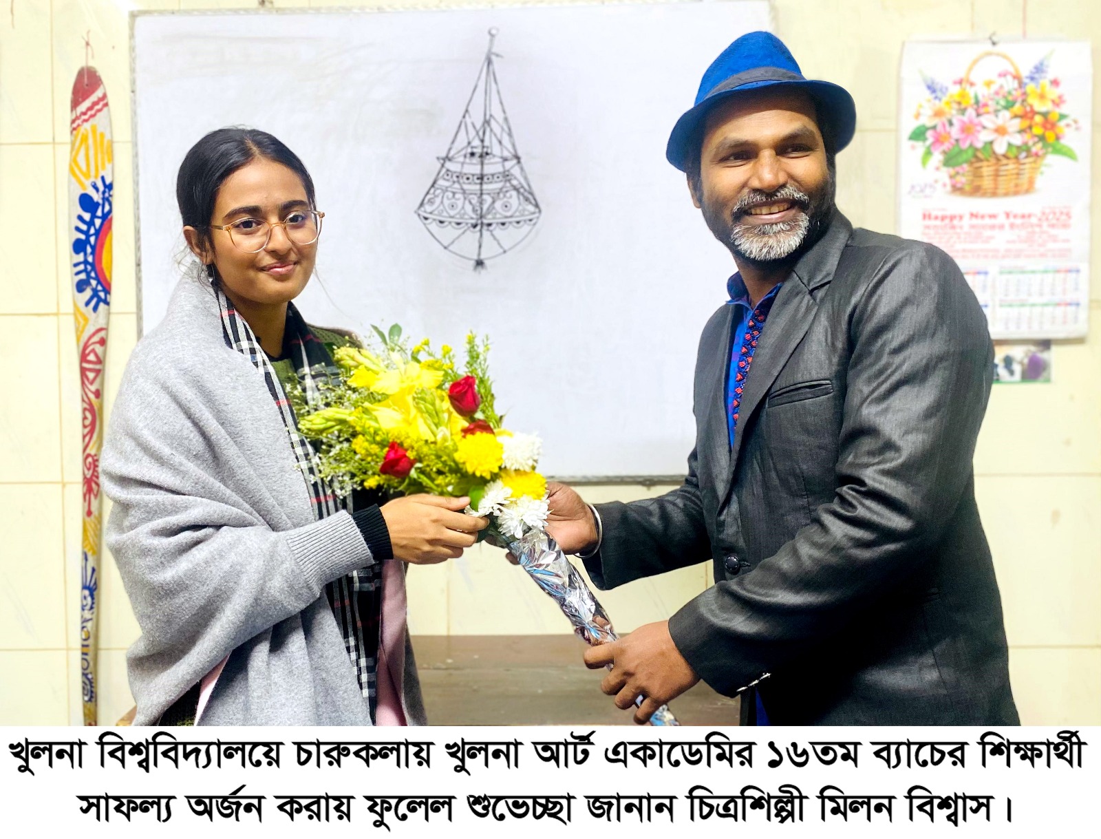 খুলনা বিশ্ববিদ্যালয় চারুকলায় সাফল্য অর্জন করায় ফুলেল শুভেচ্ছা জানালেন চিত্রশিল্পী মিলন বিশ্বাস