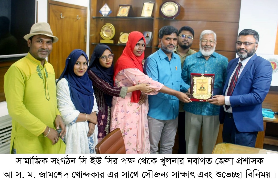 খুলনার সুবিধাবঞ্চিত শিশু ও দরিদ্র মানুষের কল্যাণে নিবেদিত সামাজিক সংগঠন কাম ফর আনপ্রিভিলিজড চাইল্ড সি ইউ সি খুলনার পক্ষ থেকে খুলনার নবাগত জেলা প্রশাসক আ স. ম. জামশেদ খোন্দকার এর সাথে সৌজন্য সাক্ষাৎ এবং শুভেচ্ছা বিনিময় অনুষ্ঠিত। গতকাল ১৯ নভেম্বর ২০২৫ বুধবার বিকাল চারটায় জেলা প্রশাসক মহোদয়ের কক্ষে এ মতবিনিময় ও শুভেচ্ছা সাক্ষাৎ অনুষ্ঠিত হয়। সংগঠনের সভাপতি জনাব মোহাম্মদ শাহিন হোসেনের নেতৃত্বে এ সময় আরো উপস্থিত ছিলেন সিইউসির অন্যতম উপদেষ্টা রোটারিয়ান পিপি জনাব মোঃ ইফতেখার আলী বাবু, যুগ্ম সম্পাদক আরিফা ইসলাম খুকুমণি, কোষাধ্যক্ষ মীমা আক্তার মনিকা, দপ্তর সম্পাদক কারীমা আক্তার, প্রচার সম্পাদক চিত্রশিল্পী মিলন বিশ্বাস, সিইউসি স্কুলের প্রধান শিক্ষক মোহাম্মদ মুজাহিদ হোসেন মিরাজ। নবাগত জেলা প্রশাসক মহোদয় সি ইউ সি সংগঠনের কার্যক্রম সম্পর্কে অবগত হন এবং প্রয়োজনীয় সহযোগিতার আশ্বাস প্রদান করেন। সিইউসি সংগঠনের পক্ষ থেকে নবগত জেলা প্রশাসক মহোদয় কে একটি শুভেচ্ছা স্মারক প্রদান করা হয়।