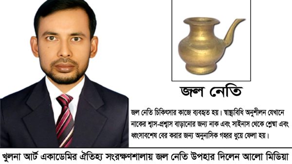 আয়শা সিদ্দিকা সাথী, খুলনা থেকে:   খুলনা আর্ট একাডেমির ঐতিহ্য সংরক্ষণশালায় আজ ১৪ই আগষ্ট ঐতিহ্যবাহী ‘জল নেতি’ উপহার দিয়েছেন আলো মিডিয়া গ্রুপের প্রতিষ্ঠাতা পরিচালক, সাংবাদিক ও সংগঠক আহমেদ হোসাইন ছানু।