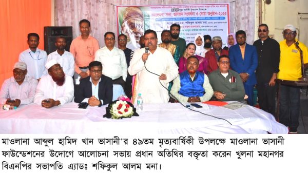 খুলনা অফিস: অবিসংবাদিত আপোষহীন মজলুম জননেতা মওলানা আব্দুল হামিদ খান ভাসানীর ৪৯তম মৃত্যু বার্ষিকী উপলক্ষে এক আলোচনা সভা, গুণীজন সংবর্ধনা ও দোয়া অনুষ্ঠানে মওলানা ভাসানী ফাউন্ডেশন, খুলনা এর উদ্যোগে