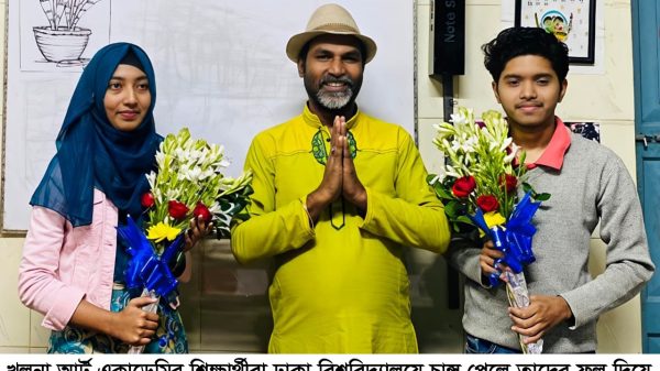 খুলনা আর্ট একাডেমির শিক্ষার্থীদের সাফল্যে চিত্রশিল্পী মিলন বিশ্বাসের ফুলেল শুভেচ্ছা